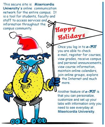 My college's online forum or whatever, where we check student email and schedules and grades and everything, used to be called CMcentral. Now it's e-MU, because it's Misericordia University instead of College Misericordia. When they changed the name, they changed the mascot to an emu, and it's kind of scary looking. Now it's even scarier, because "Happy Holidays" replaced "e-MU" on its flag and it wears a Santa hat.